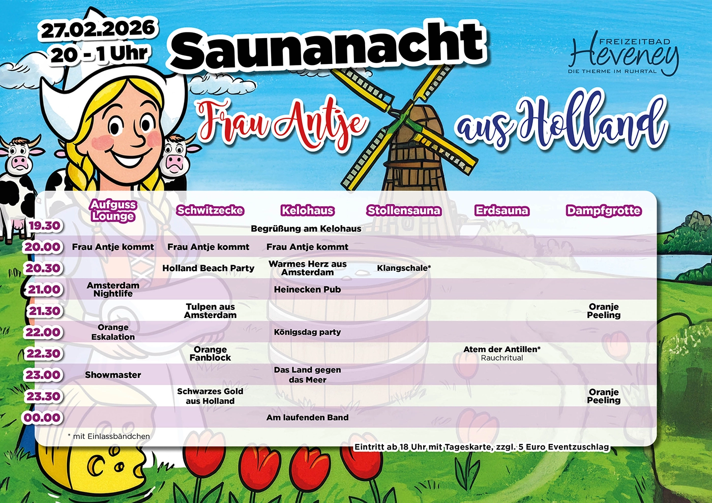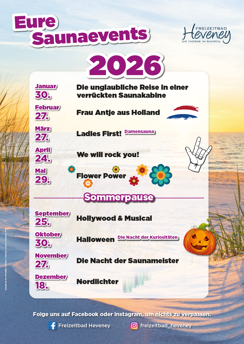 Das Sauna-Special hat bereits im Gesundheitspark Nienhausen, im Revierpark Vonderort und auch in der Niederrhein Therme viele Fans für sich gewinnen können. Ein besonderer Abend für beste Freundinnen, die sich ungestört einen besonderen Wellnessabend gönnen wollen. Die Männer und die regulären Gäste müssen an diesem Eventtag das Bad gegen 18 Uhr verlassen. Wir freuen uns auf Euch!