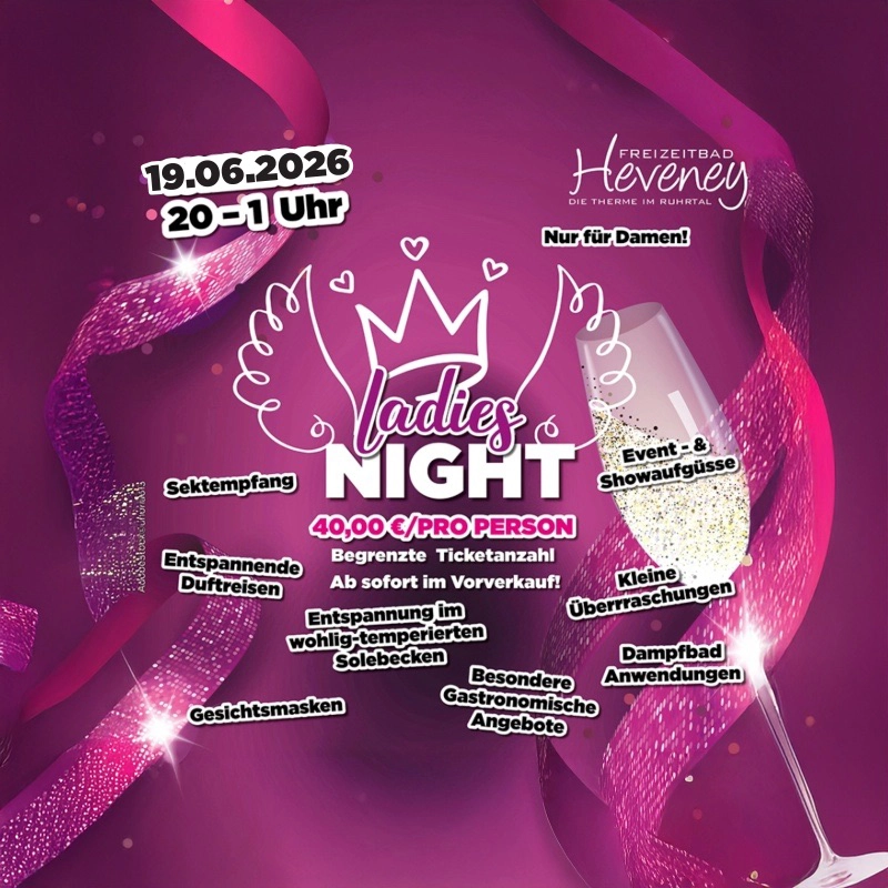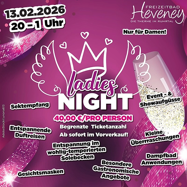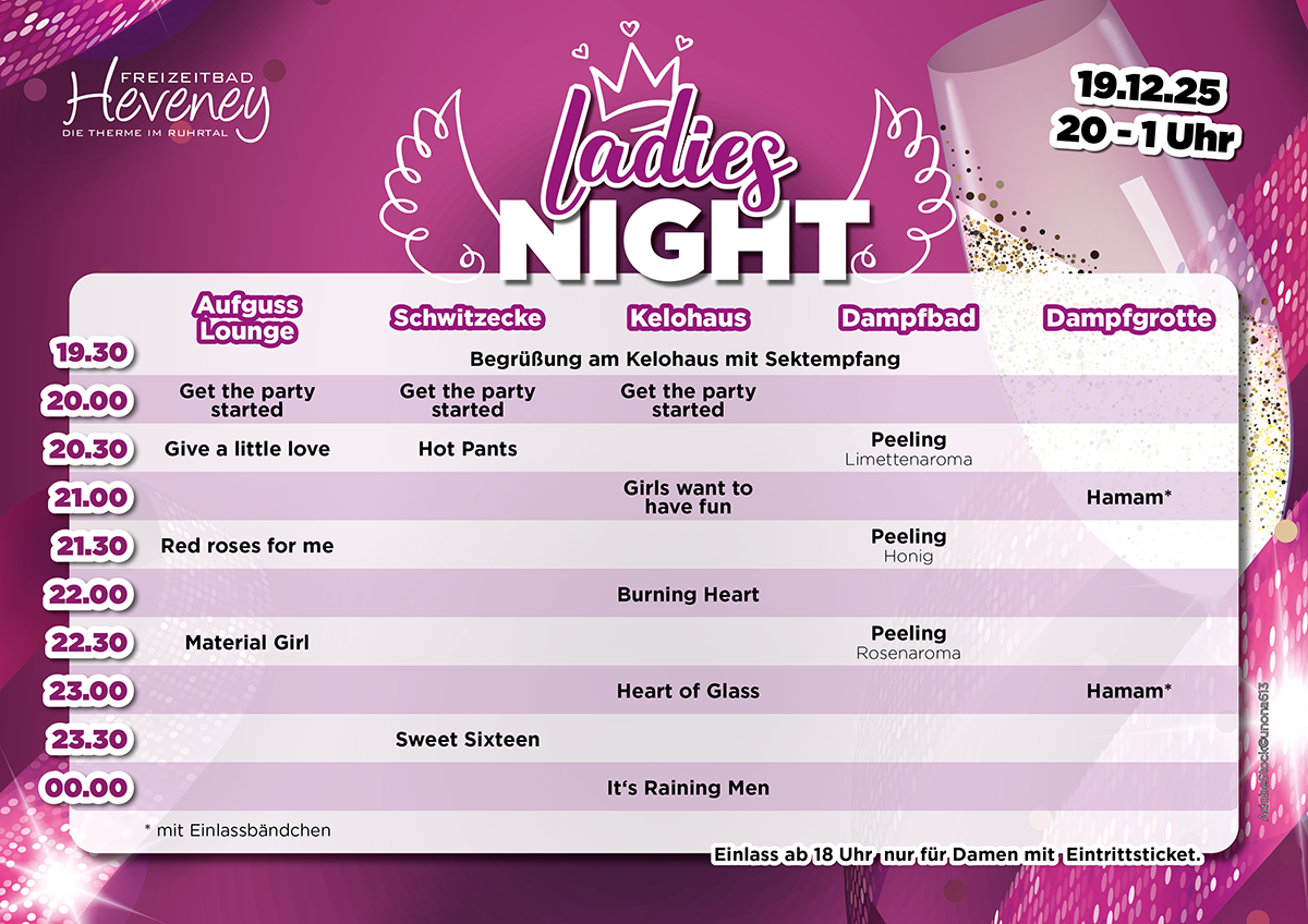 Das Sauna-Special hat bereits im Gesundheitspark Nienhausen, im Revierpark Vonderort und auch in der Niederrhein Therme viele Fans für sich gewinnen können. Ein besonderer Abend für beste Freundinnen, die sich ungestört einen besonderen Wellnessabend gönnen wollen. Die Männer und die regulären Gäste müssen an diesem Eventtag das Bad gegen 18 Uhr verlassen. Wir freuen uns auf Euch!